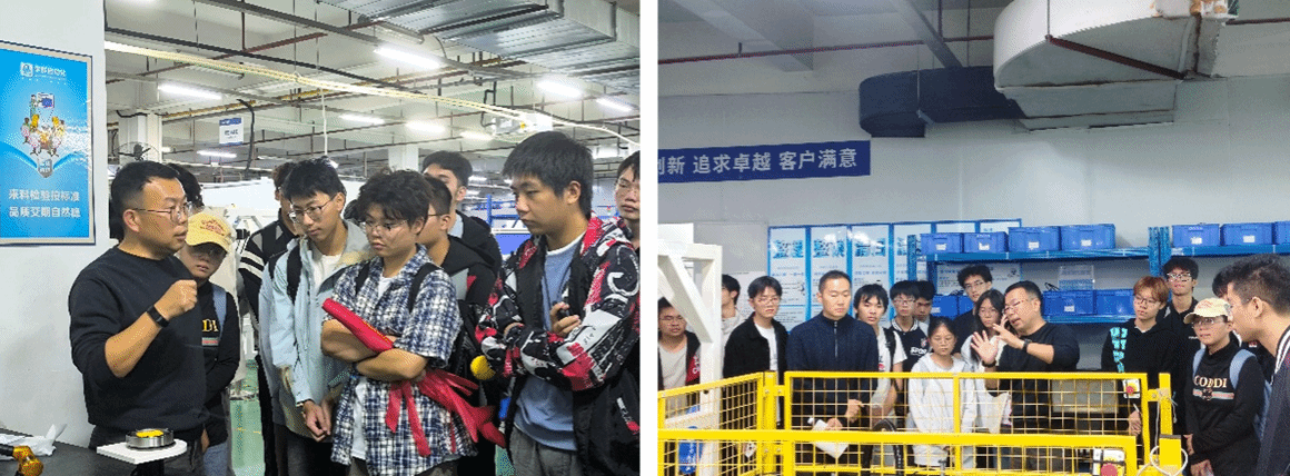 随后,同学们实地观摩了六轴机器人、蜘蛛臂机器人等 3 款核心产品,直观了解其精密结构与动作逻辑;在产线环节,工程师团队拆解了机器人组装的分工流程,并结合不同场景讲解了设备的适配方案;最后,同学们还参观了打包与组装件测量工序,完整感知了工业机器人的全生命周期生产链路。