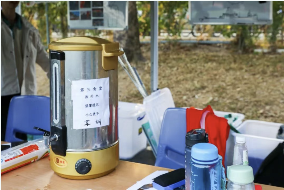 在同学们于训练场挥汗如雨、认真投入训练之际,学校食堂也尽显贴心关怀——工作人员提前在军训大本营精心设置了供水点,备好了足量的温水,方便同学们训练间隙随时取用、及时补充水分,用细致的后勤保障为大家的军训时光保驾护航。