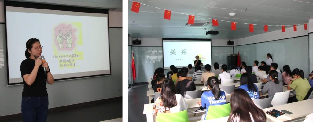随后,心理中心指导老师陈紫意以轻松幽默的方式做了主题为“关系”的心理工作分享,她指出老员工活中很多烦恼源于个体对自己和他人的关系的看法,通过一系列的案例阐述了人际关系的重要性,并“如何建立和谐的人际关系”等问题提出了建议。在提问环节中,陈紫意老师与在场的心理委员展开了热烈的互动。