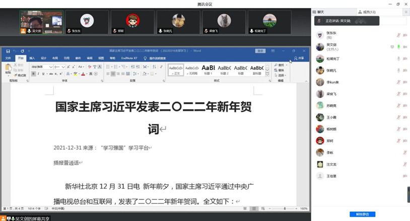 2022年3月17日,高分子系全体教师党员以腾讯会议形式开展“学习疫情防控精神 保障在线教学质量”活动,并集体学习国家主席习近平二Ο二二新年贺词。会议由高分子系支部书记吴文剑主持。