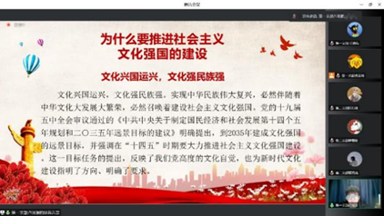 “文化兴国运兴,文化强民族强,实现中华民族伟大复兴,必须建设社会主义文化强国。”员工党员卢泽源图文并茂展示了中华文化的辉煌成果,他呼吁既要推动中华传统文化走出去,也要提高文化交流层次,坚持百花齐放、百家争鸣的方针,支持鼓励多元文化平等交流。