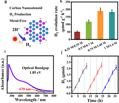 该研究成果首次使用自下而上的方法合成了氮掺杂的碳纳米螺线管材料(N-CNS),并且给出明确的结构。N-CNS是通过理性的Suzuki聚合反应,经氧化环化脱氢得到的。通过GPC、FTIR、固体13C NMR和Raman等表征技术对N-CNS的成功合成进行了充分表征。利用低剂量集成差分相衬度扫描透射电子显微镜(iDPC-STEM )技术清晰地解析N-CNS螺旋的固有分子结构(图2a-2f), 同时考察了这一类新型氮掺杂碳螺线管材料光催化产氢(图2g-2j)和催化有机反应的性能。这一成果扩充了功能性弯曲碳纳米材料的范畴,为未来开发多种独特功能的碳螺线管材料提供了实验基础。(相关论文信息链接:https://doi.org/10.1038/s41467-023-41467-4)