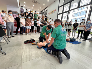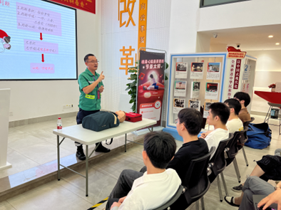 在培训前,师生党员们通过东莞急救小程序完成了自学和线上考核。培训过程中,学员们在讲师的指导下,通过模拟人进行实践操作,逐一练习了心肺复苏、海姆立克急救法等技能,并在救护导师的严格考核下,现场全体师生顺利通过了“初级救护员”的认证考核。
