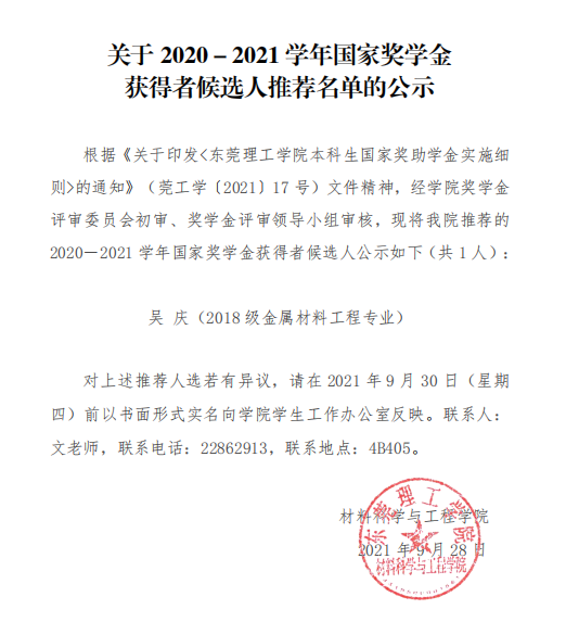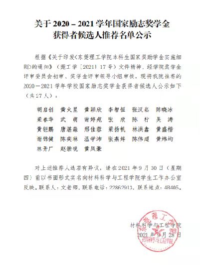 伟德国际1946bv官网推荐2020-2021年国家奖学金获得者候选人和国家励志奖学金获得者候选人名单公示