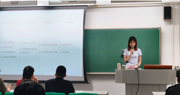 接下来,智造2班的助班邱海怡学姐向我们分享了她的学习经验与大学生活规划经验。从自己的亲身经历着手,向我们提供了新的发展方向与建议。她表示“在大学生活中拓展视野是极其重要的,但更重要的是怎样将所学习到的理论与经验运用在实际解决问题中。”相信有了更好的榜样,智能制造工程专业的同学们也会充满了追求卓越的勇气与方向。