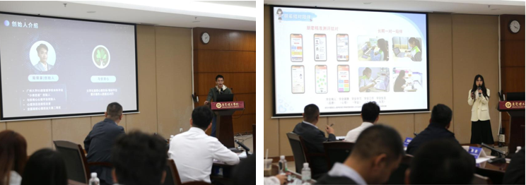 路演环节中,八个创新创业项目依次路演展示,覆盖人工智能、跨境电商、心理健康、文化IP等多个前沿领域。 项目展示后,来自广州大学的刘英老师等评委从技术可行性、商业模式、市场潜力等维度提出专业建议,为创业者优化方向提供参考。